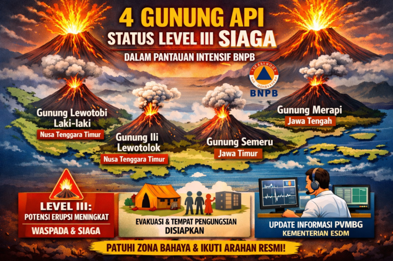 KLIKINAJA – Aktivitas vulkanik di sejumlah wilayah Indonesia kembali menjadi perhatian. Badan Nasional Penanggulangan Bencana (BNPB) memastikan pemantauan intensif terhadap empat gunung api yang kini berstatus Siaga atau Level III. Langkah ini di tempuh untuk mengantisipasi potensi erupsi sekaligus meminimalkan risiko bagi masyarakat yang tinggal di kawasan rawan.