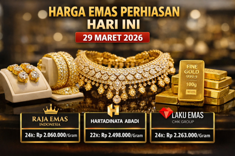 KLIKINAJA.COM – Pergerakan harga emas perhiasan di pasar domestik terpantau belum banyak berubah pada Minggu, 29 Maret 2026. Sejumlah ritel besar seperti Raja Emas Indonesia, Hartadinata Abadi, dan Laku Emas masih mempertahankan harga jual di berbagai kadar karat.