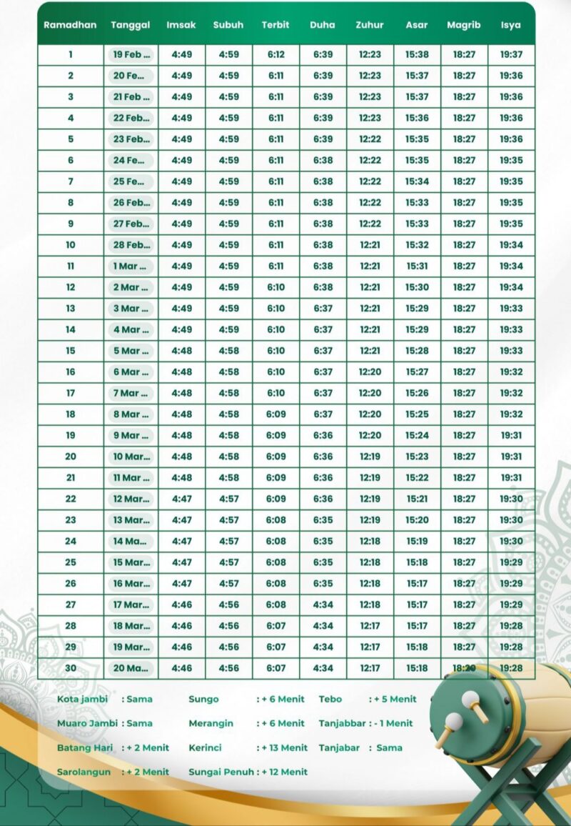 KLIKINAJA – Bulan suci Ramadan 1447 Hijriah semakin dekat. Umat Muslim di Provinsi Jambi mulai menyiapkan diri menyambut ibadah puasa, termasuk memastikan jadwal imsak dan waktu berbuka agar tidak terjadi kekeliruan saat sahur maupun magrib.