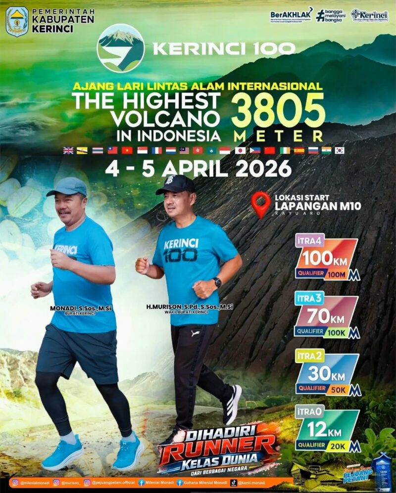 KLIKINAJA.COM – Pemerintah Kabupaten Kerinci kembali menggenjot promosi wisata melalui pendekatan sport tourism. Salah satu langkah konkret yang di siapkan adalah penyelenggaraan Kerinci 100, event lari lintas alam bertaraf internasional yang di jadwalkan berlangsung pada 4–5 April 2026.