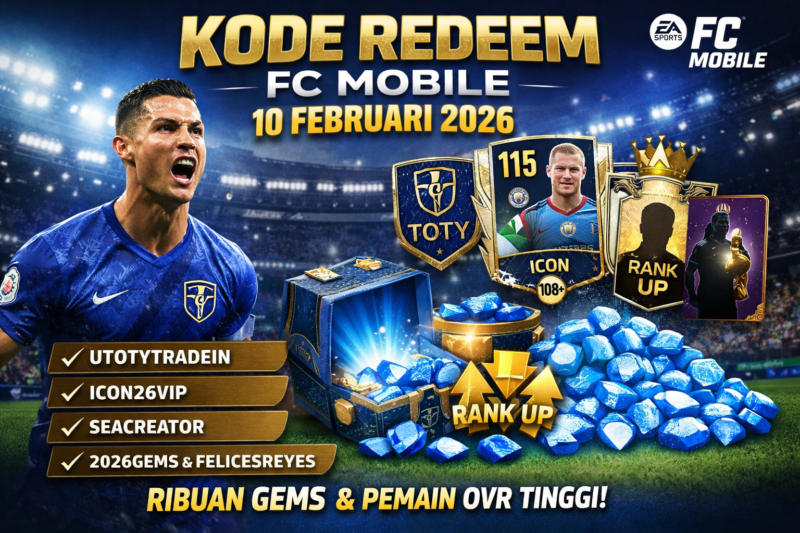 KLIKINAJA – Komunitas EA FC Mobile kembali di ramaikan dengan rilis kode redeem terbaru yang bisa di klaim pada Selasa, 10 Februari 2026. EA menghadirkan deretan kode yang menawarkan hadiah bernilai tinggi, mulai dari ribuan Gems, item Rank Up, sampai pemain dengan Overall Rating (OVR) tinggi, termasuk kategori Icon dan pemain event terbatas.