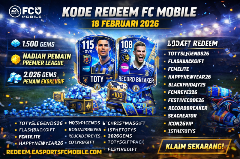 KLIKINAJA – Pemain EA Sports FC Mobile kembali memburu kode redeem terbaru yang beredar pada 18 Februari 2026. Deretan kode ini di klaim menghadirkan berbagai hadiah menarik, mulai dari ribuan Gems, Rank Up item, hingga pemain dengan Overall Rating (OVR) tinggi.