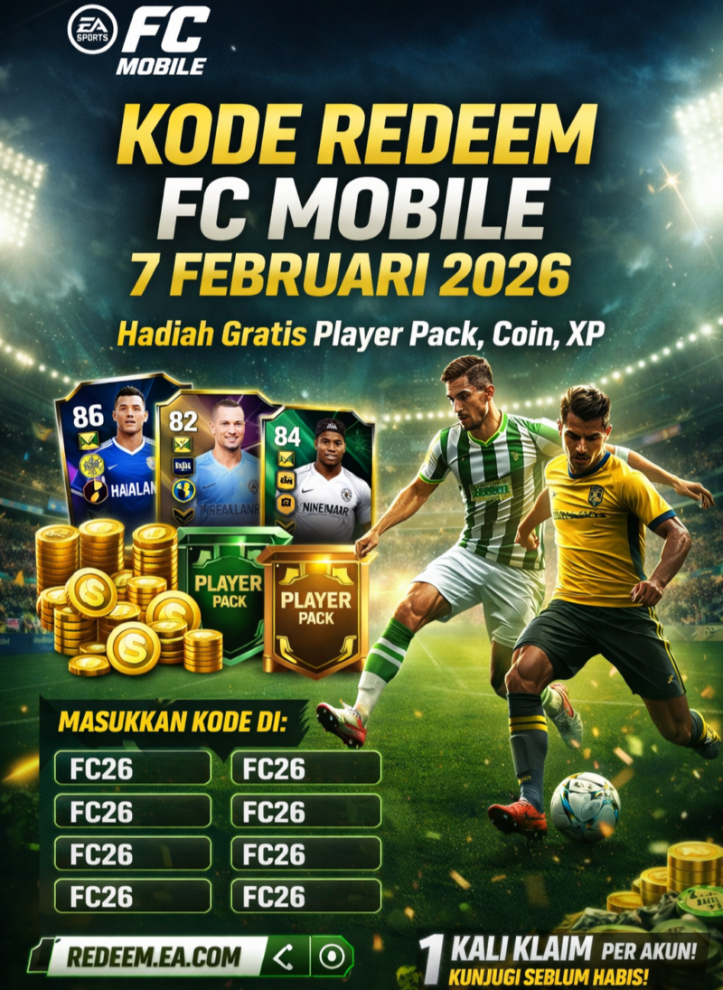 KLIKINAJA – EA Sports kembali membagikan kode redeem untuk para pemain EA Sports FC Mobile pada Jumat, 7 Februari 2026. Kode redeem ini dapat di tukarkan dengan berbagai hadiah menarik seperti Player Pack, Coin, Training XP, hingga item pendukung tim tanpa perlu melakukan pembelian dalam aplikasi.