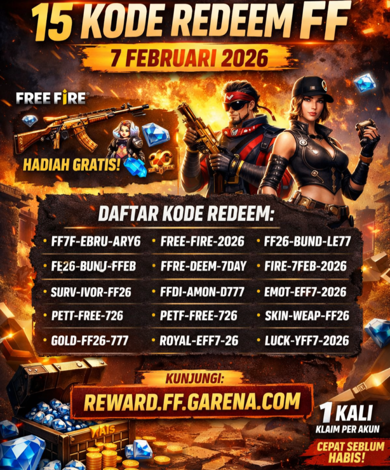 KLIKINAJA – Garena kembali membuka peluang bagi pemain Free Fire untuk mendapatkan item gratis melalui pembagian kode redeem terbaru pada Sabtu, 7 Februari 2026. Sebanyak 15 kode redeem di rilis dan dapat di tukarkan oleh pemain selama kuota masih tersedia.