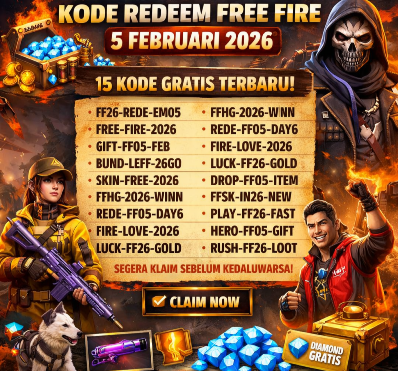 KLIKINAJA – Para survivor di dunia Free Fire kembali di suguhi kesempatan emas pada Kamis, 5 Februari 2026. Pengembang gim ini, Garena, merilis sederet kode redeem yang bisa di tukar dengan berbagai item eksklusif tanpa perlu mengeluarkan diamond.