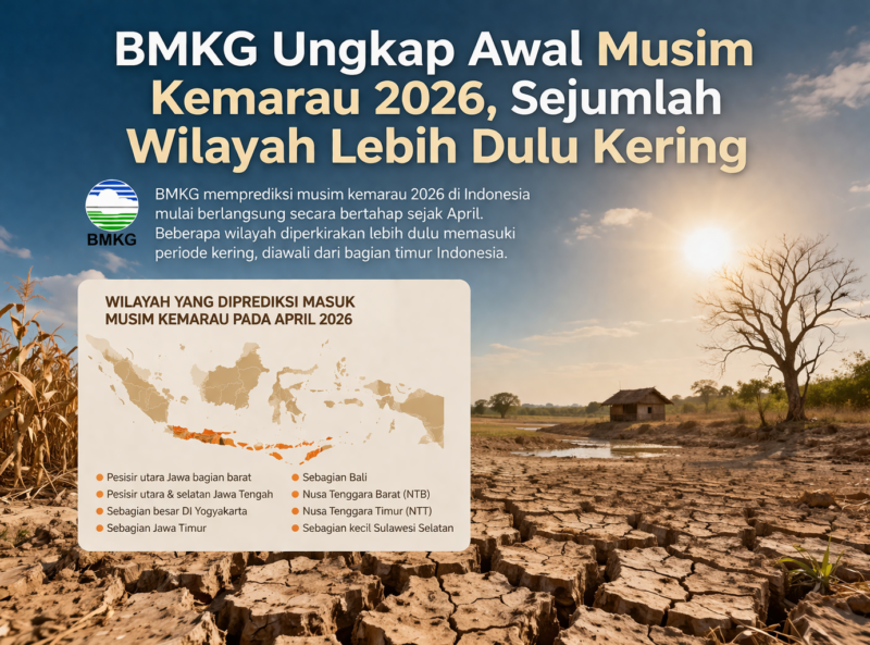 KLIKINAJA.COM – Badan Meteorologi, Klimatologi, dan Geofisika (BMKG) merilis proyeksi terbaru terkait pola musim kemarau 2026 di Indonesia. Berdasarkan laporan resminya, periode kemarau tidak datang bersamaan di seluruh wilayah, melainkan mulai berlangsung secara bertahap sejak April.