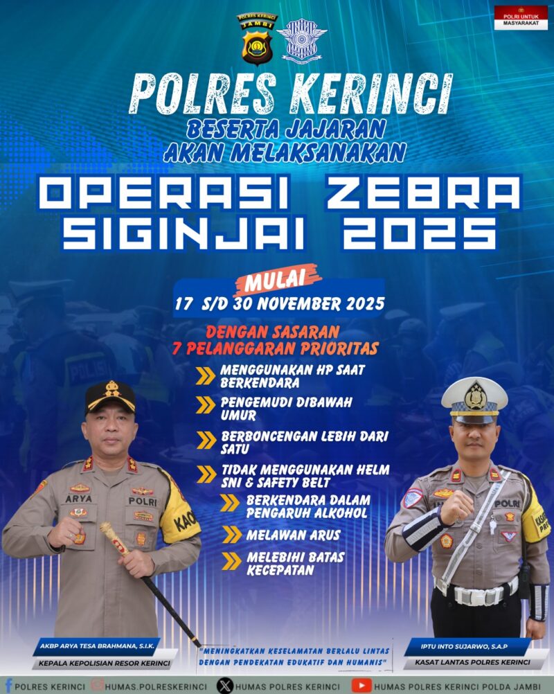 Kepolisian Resor (Polres) Kerinci bersama seluruh jajaran siap melaksanakan Operasi Zebra Singinjai 2025 selama dua pekan. Operasi ini merupakan bagian dari agenda nasional untuk meningkatkan kesadaran masyarakat terhadap pentingnya keselamatan berkendara.