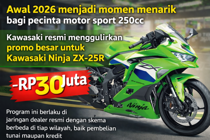 KLIKINAJA – Awal 2026 menjadi momen menarik bagi pecinta motor sport 250cc. Kawasaki resmi menggulirkan promo besar untuk Kawasaki Ninja ZX-25R dengan potongan harga hingga Rp30 juta. Program ini berlaku di jaringan dealer resmi dengan skema berbeda di tiap wilayah, baik pembelian tunai maupun kredit.