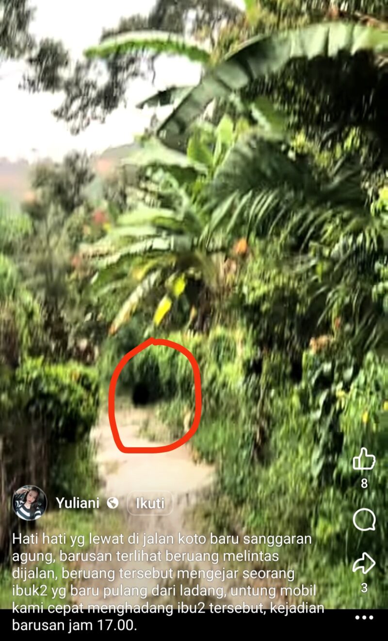 Informasi tersebut pertama kali menyebar melalui unggahan akun Facebook milik Yuliani, yang membagikan sebuah video disertai peringatan kepada warga. Dalam keterangannya, ia mengimbau masyarakat agar berhati-hati ketika melintasi jalur di Desa Koto Baru Sanggaran Agung karena seekor beruang terlihat muncul di kawasan itu.