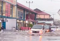 Hujan Deras Picu Banjir di Depan Kampus AMIK Depati Parbo, Kendaraan Sempat Kesulitan Melintas